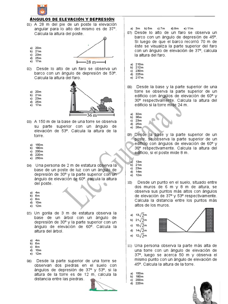 Calcula la altura del poste. 07) Desde lo alto de un faro se observa un