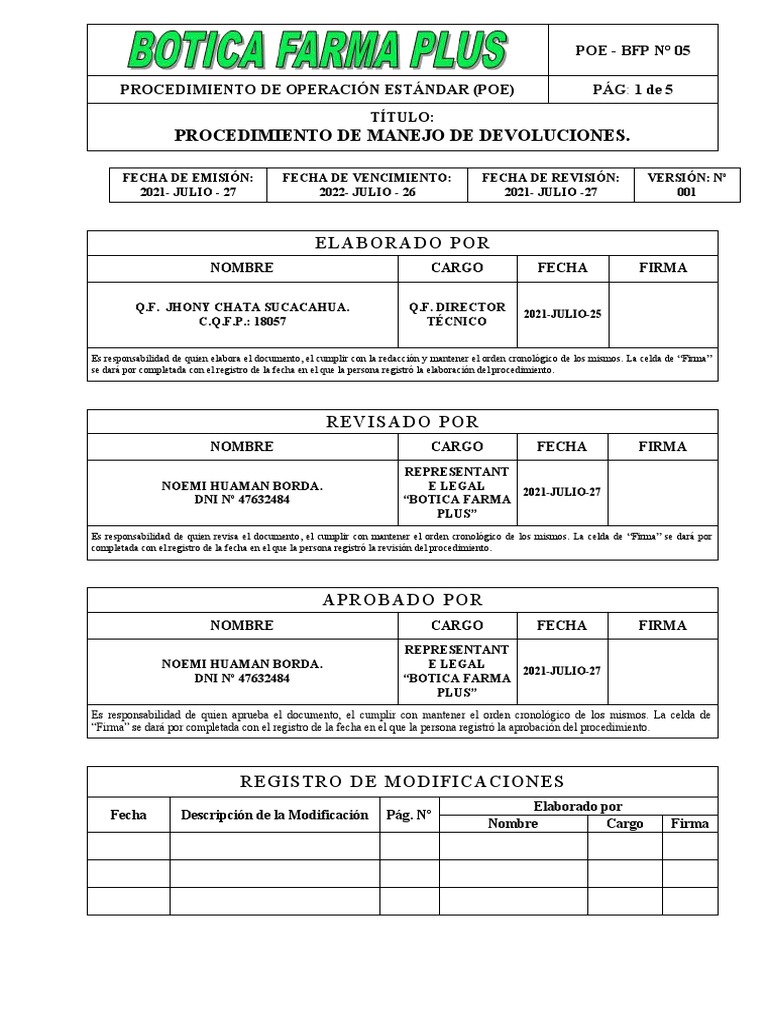 6.1.1. La oficina farmacéutica o la dirección técnica de “BOTICA FARMA PLUS” deberá realizar