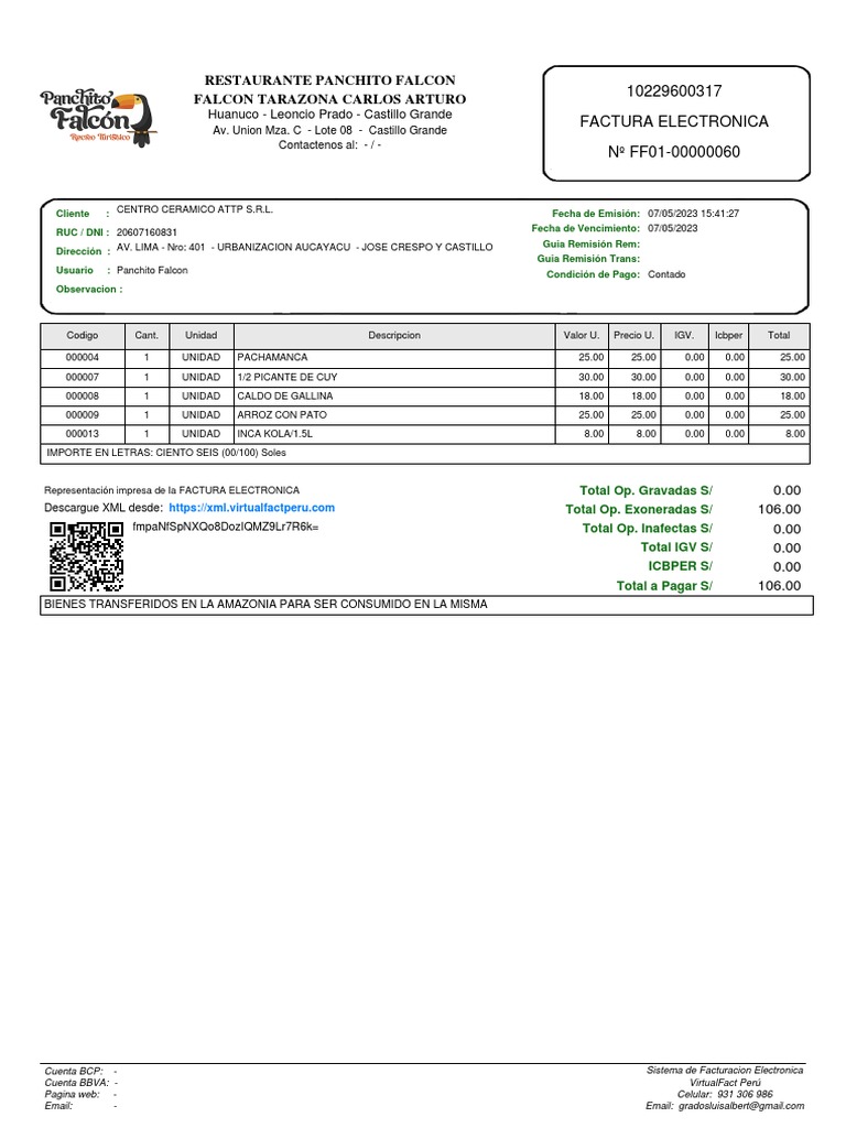 Descargue XML desde: [Link] Total Op. Exoneradas S/ 106.00
