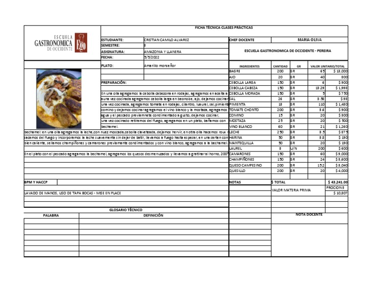PLATO: Amarillo monseñor INGREDIENTES CANTIDAD GR VALOR UNITARIO/TOTAL