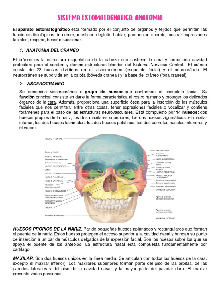 consta de 22 huesos divididos en el viscerocráneo (esqueleto facial) y el neurocráneo. El