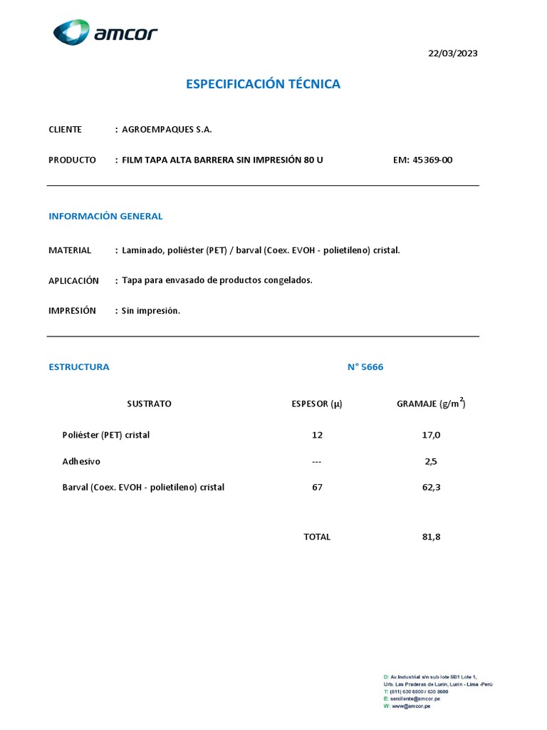 PRODUCTO : FILM TAPA ALTA BARRERA SIN IMPRESIÓN 80 U EM: 45369-00