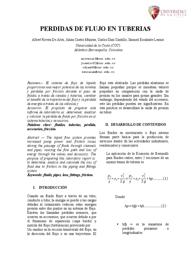 Palabras clave: fluidos, tuberías, pérdida, II. DESARROLLO DE CONTENIDOS