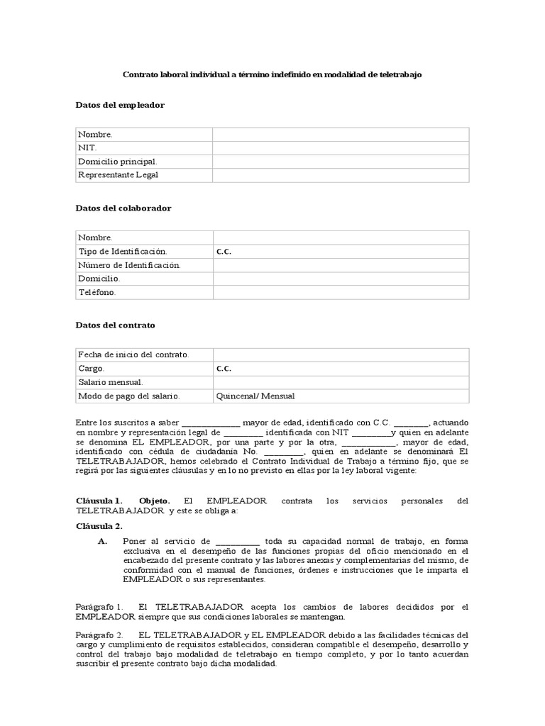 Contrato laboral individual a término indefinido en modalidad de teletrabajo