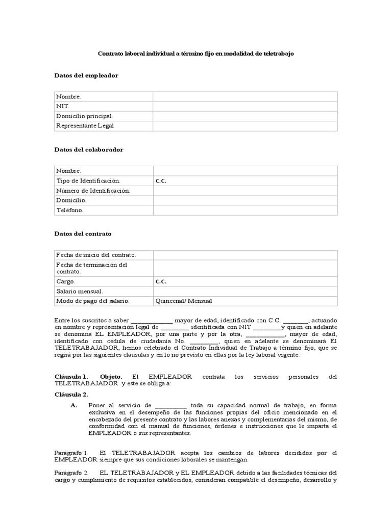 Contrato laboral individual a término fijo en modalidad de teletrabajo