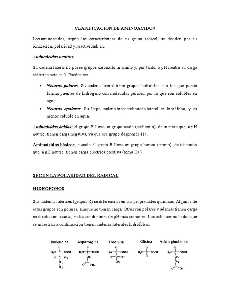 Los aminoácidos, según las características de su grupo radical, se dividen por su