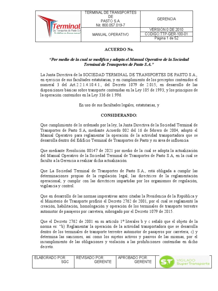 del Manual Operativo de la Sociedad Terminal de Transportes de Pasto S.A, en la cual se