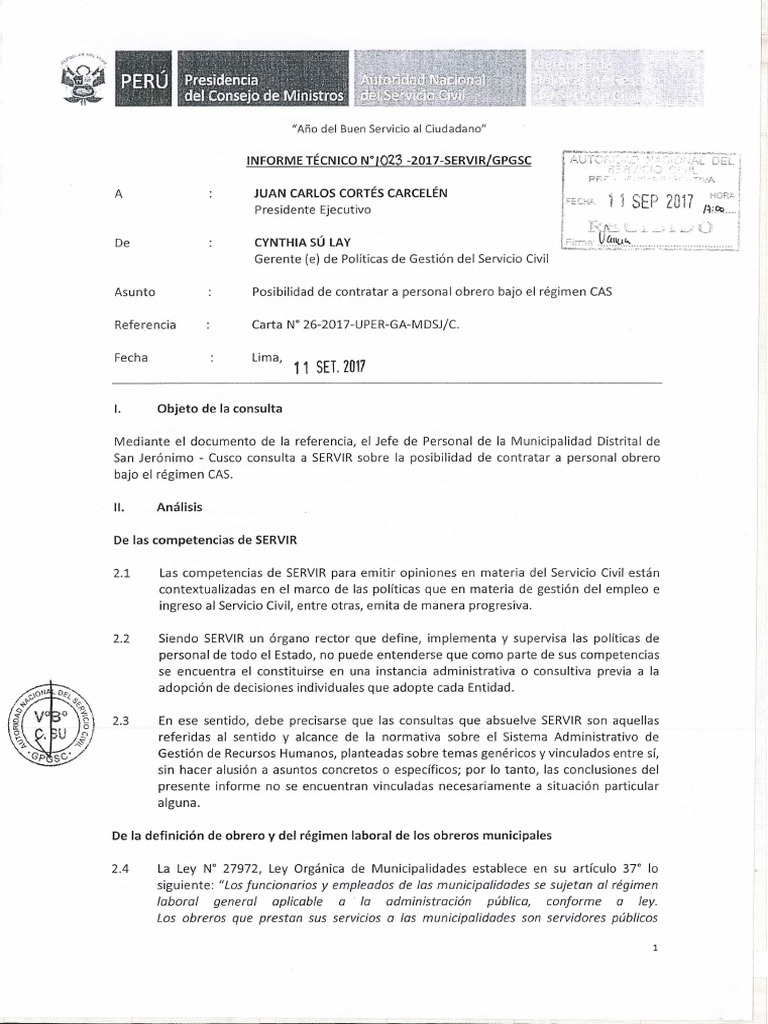 Asunto Posibilidad de contratar a personal obrero bajo el régimen CAS
