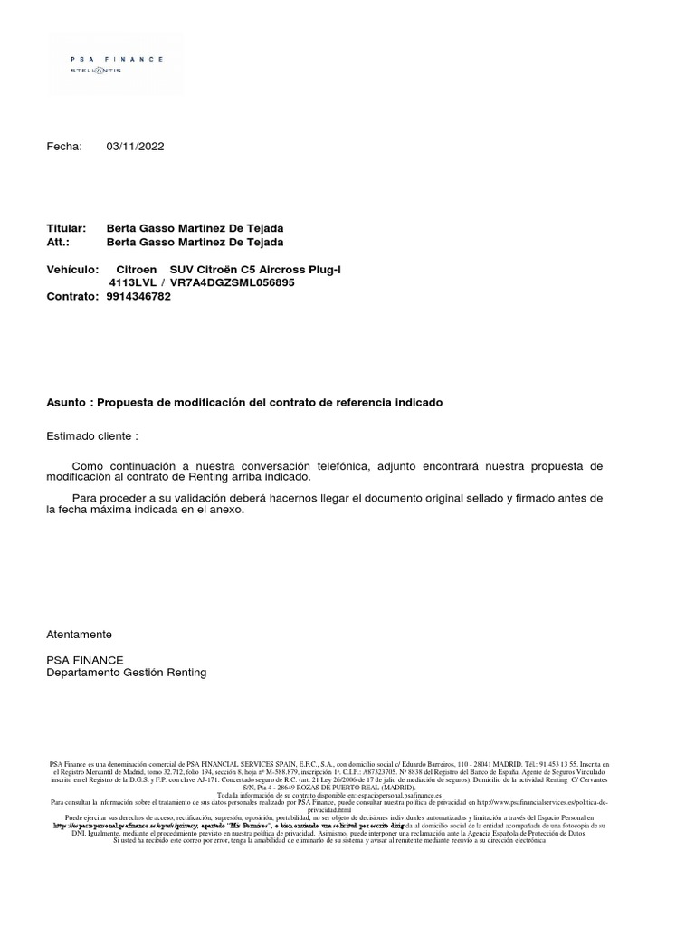 14/12/2022 a:PSA Finance, dpto. Gestión Renting:C/ Eduardo Barreiros,110 28041,Madrid
