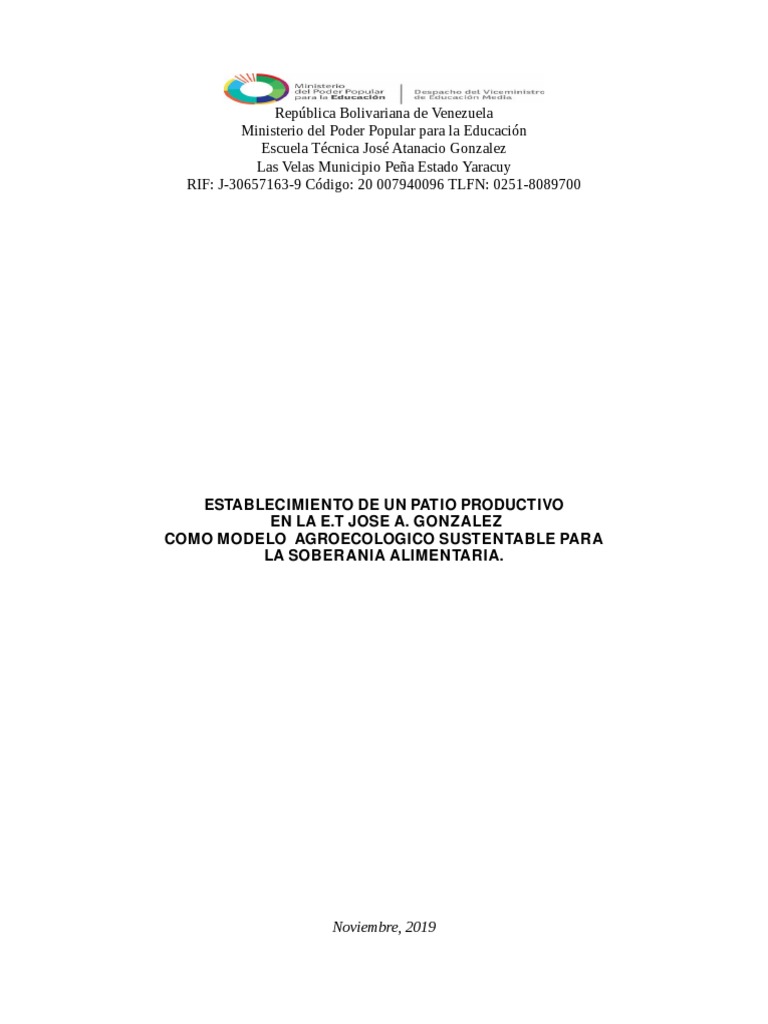 Establecimiento de un patio Productivo en la E.T José [Link] como modelo agroecologico