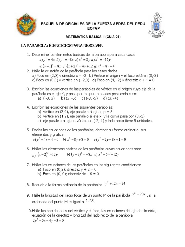 6. Hallar los elementos básicos de las parábolas cuyas ecuaciones son: