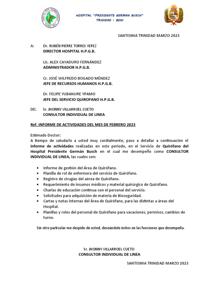 informe de actividades realizadas en este periodo, en el Servicio de Quirófano del