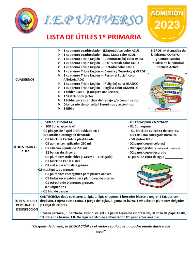 LISTA DE ÚTILES 1º PRIMARIA
