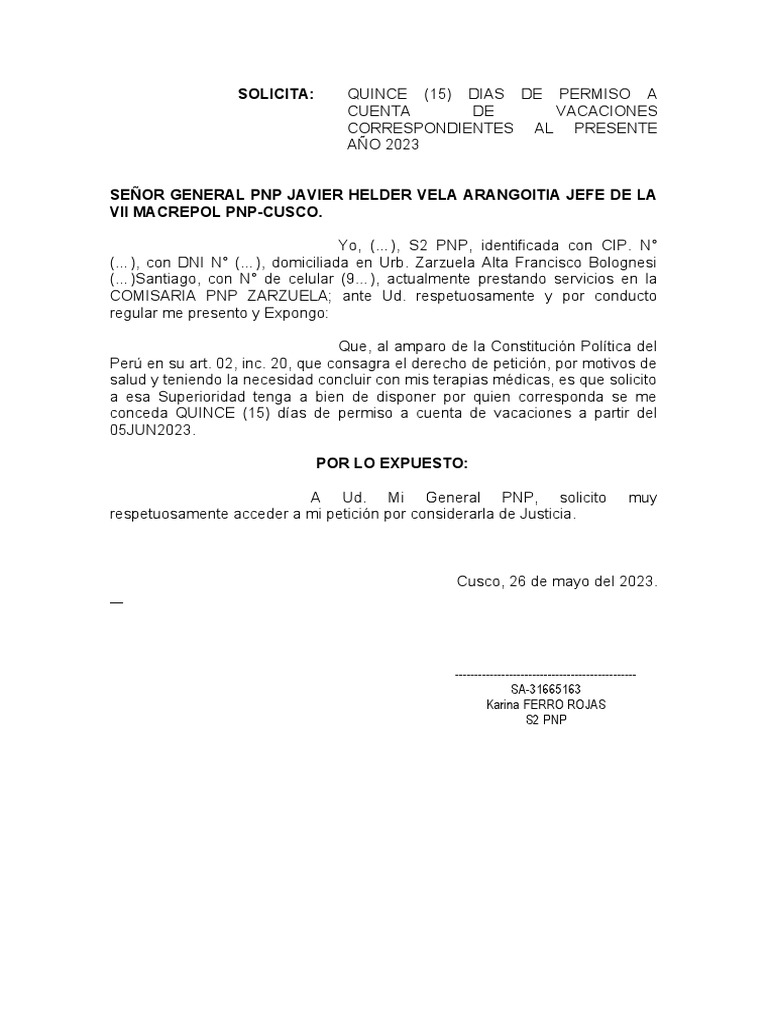 SOLICITA: QUINCE (15) DIAS DE PERMISO A