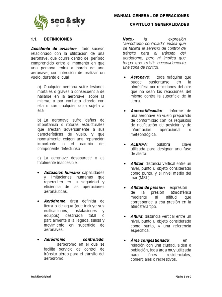1.1.1 Los términos a continuación para la operación de trabajos de taxi aéreo tendrán