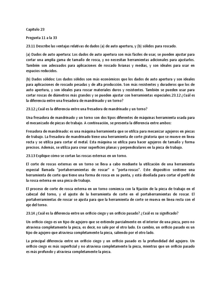 23.11 Describe las ventajas relativas de dados (a) de auto apertura, y (b) sólidos para roscado.