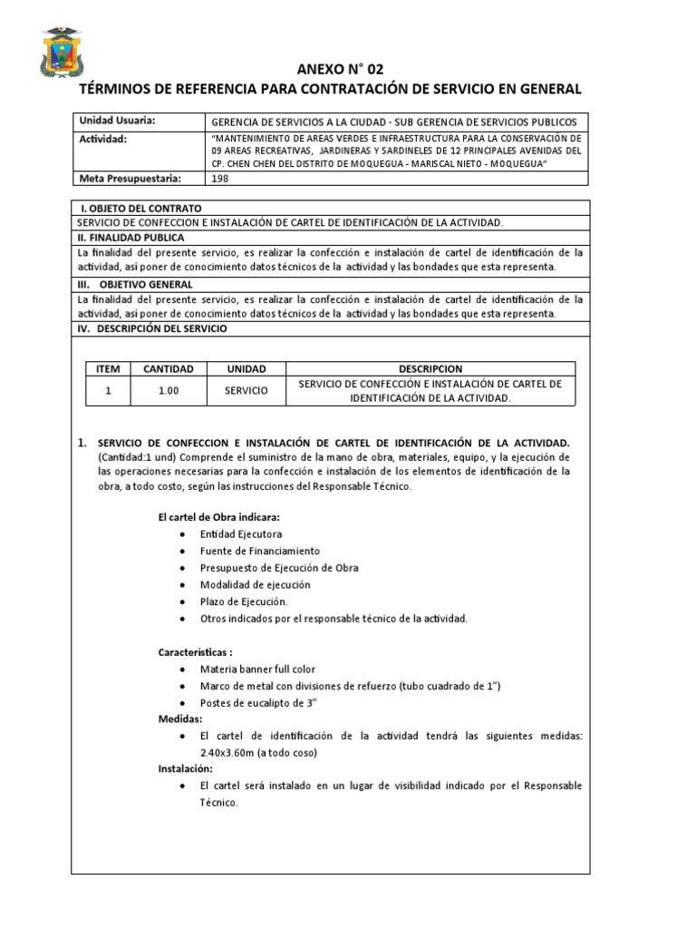 La finalidad del presente servicio, es realizar la confección e instalación de cartel de identificación de la