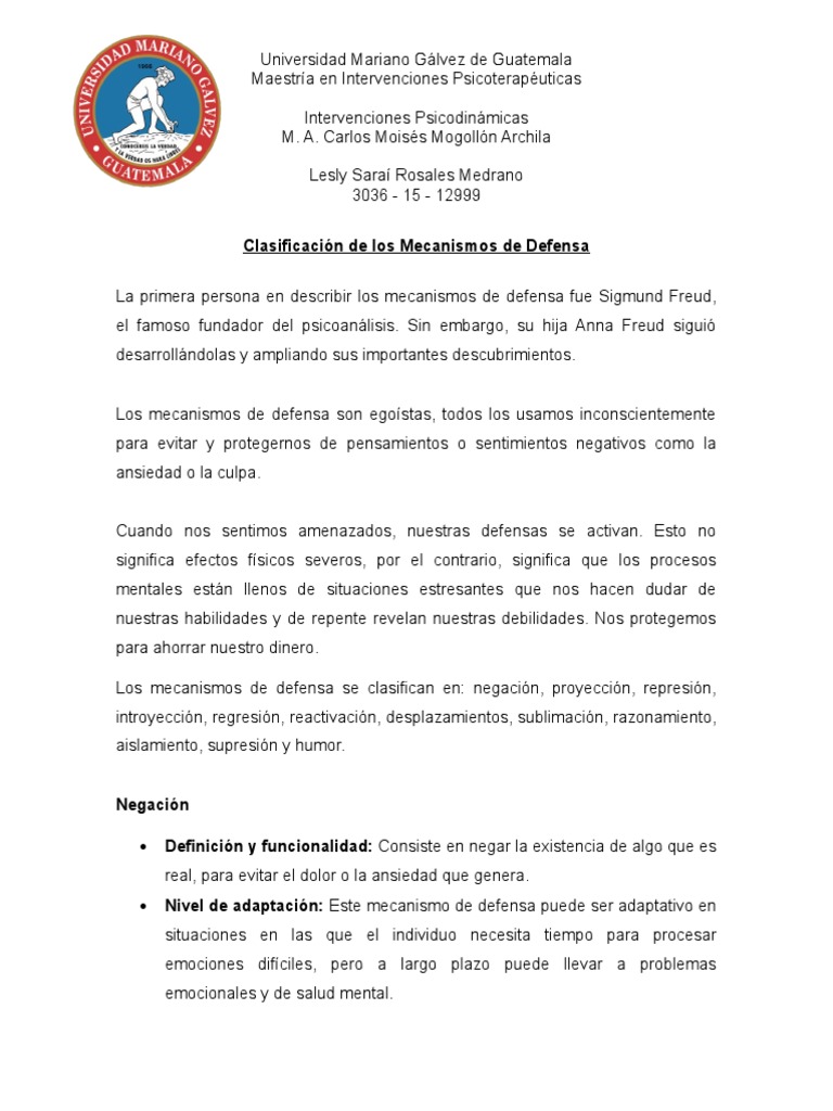 Los mecanismos de defensa se clasifican en: negación, proyección, represión,