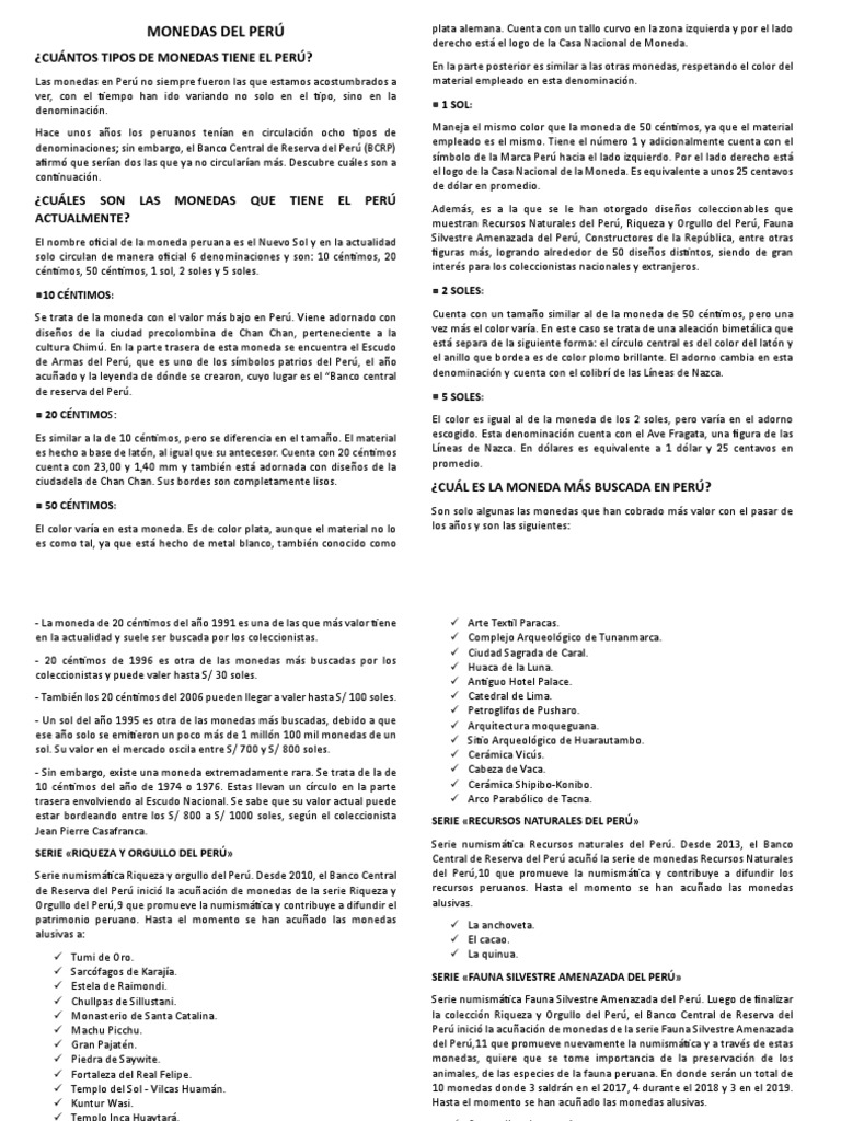 El nombre oficial de la moneda peruana es el Nuevo Sol y en la actualidad Silvestre Amenazada del Perú, Constructores de la República, entre otras