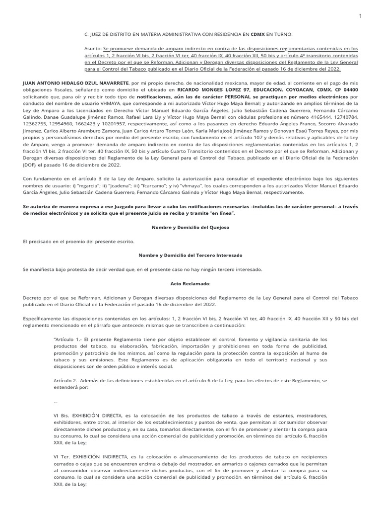 de Amparo, vengo a promover demanda de amparo indirecto en contra de las disposiciones reglamentarias contenidas en los artículos 1, 2