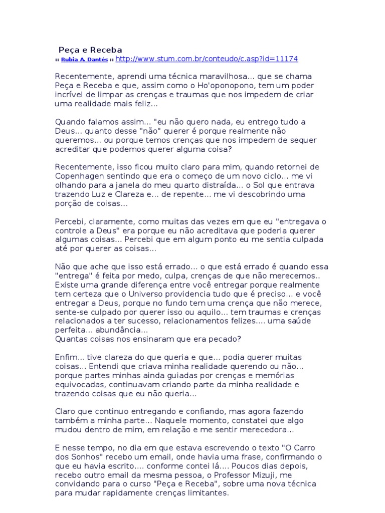 Recentemente, aprendi uma tcnica maravilhosa... que se chama Pea e Receba e que, assim como o Ho'oponopono, tem um poder incrvel de limpar as crenas e traumas que nos impedem de criar uma realidade mais feliz... Quando falamos assim... "eu no quero nada, eu entrego tudo a Deus... quanto desse "no" querer porque realmente no queremos... ou porque temos crenas que nos impedem de sequer acreditar que podemos querer alguma coisa? Recentemente, isso ficou muito claro para mim, quando retornei de Copenhagen sentindo que era o comeo de um novo ciclo... me vi olhando para a janela do meu quarto distrada... o Sol que entrava trazendo Luz e Clareza e... de repente... me vi descobrindo uma poro de coisas... Percebi, claramente, como muitas das vezes em que eu "entregava o controle a Deus" era porque eu no acreditava que poderia querer algumas coisas... Percebi que em algum ponto eu me sentia culpada at por querer as coisas... No que ache que isso est errado... o que est errado quando essa "entrega" feita por medo, culpa, crenas de que no merecemos.. Existe uma grande diferena entre voc entregar porque realmente tem certeza que o Universo providencia tudo que preciso... e voc entregar a Deus, porque no fundo tem uma crena que no merece, sente-se culpado por querer isso ou aquilo... tem traumas e crenas relacionados a ter sucesso, relacionamentos felizes.... uma sade perfeita... abundncia... Quantas coisas nos ensinaram que era pecado? Enfim... tive clareza do que queria e que... podia querer muitas coisas... Entendi que criava minha realidade querendo ou no... porque partes minhas ainda guiadas por crenas e memrias equivocadas, continuavam criando parte da minha realidade e trazendo coisas que eu no queria... Claro que continuo entregando e confiando, mas agora fazendo tambm a minha parte... Naquele momento, constatei que algo mudou dentro de mim, em relao e me sentir merecedora... E nesse tempo, no dia em que estava escrevendo o texto "O Carro dos Sonhos" recebo um email, onde havia uma frase, confirmando o que eu havia escrito.... conforme contei l.... Poucos dias depois, recebo outro email da mesma pessoa, o Professor Mizuji, me convidando para o curso "Pea e Receba", sobre uma nova tcnica para mudar rapidamente crenas limitantes.