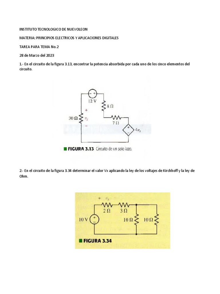2.- En el circuito de la figura 3.34 determinar el valor Vx aplicando la ley de los voltajes de Kirchhoff y la ley de
