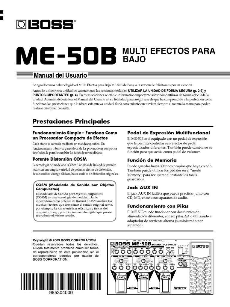 Le agradecemos haber elegido el Multi Efectos para Bajo ME-50B de Boss, a la vez que le felicitamos por su elección.