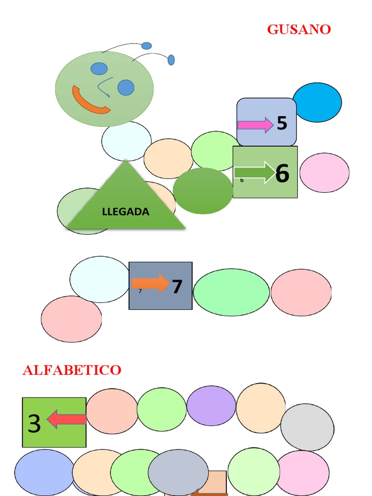 Un documento describe la llegada de un gusano alfabéticamente ordenado con números. Se mencionan las letras G, U, S y A, así como los números del 5 al 7 en orden.