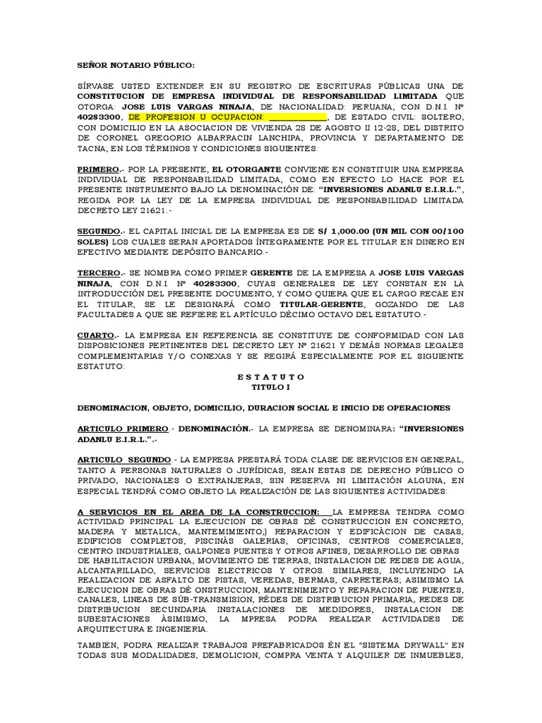 CONSTITUCION DE EMPRESA INDIVIDUAL DE RESPONSABILIDAD LIMITADA QUE