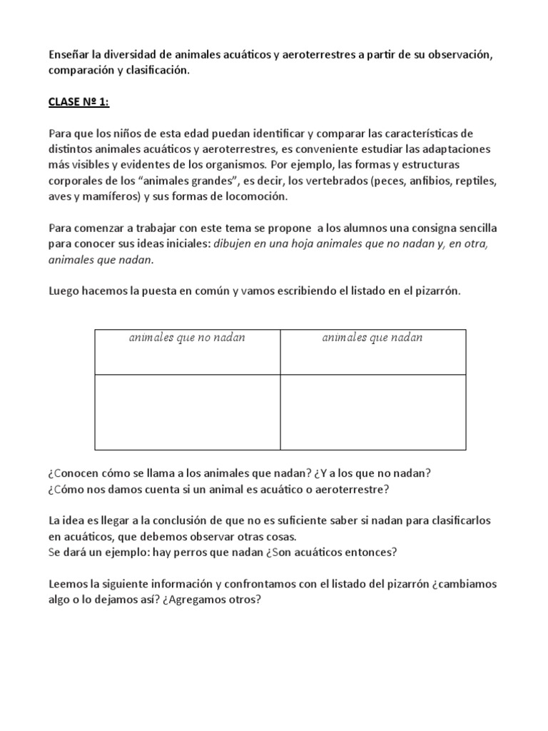 para conocer sus ideas iniciales: dibujen en una hoja animales que no nadan y, en otra,