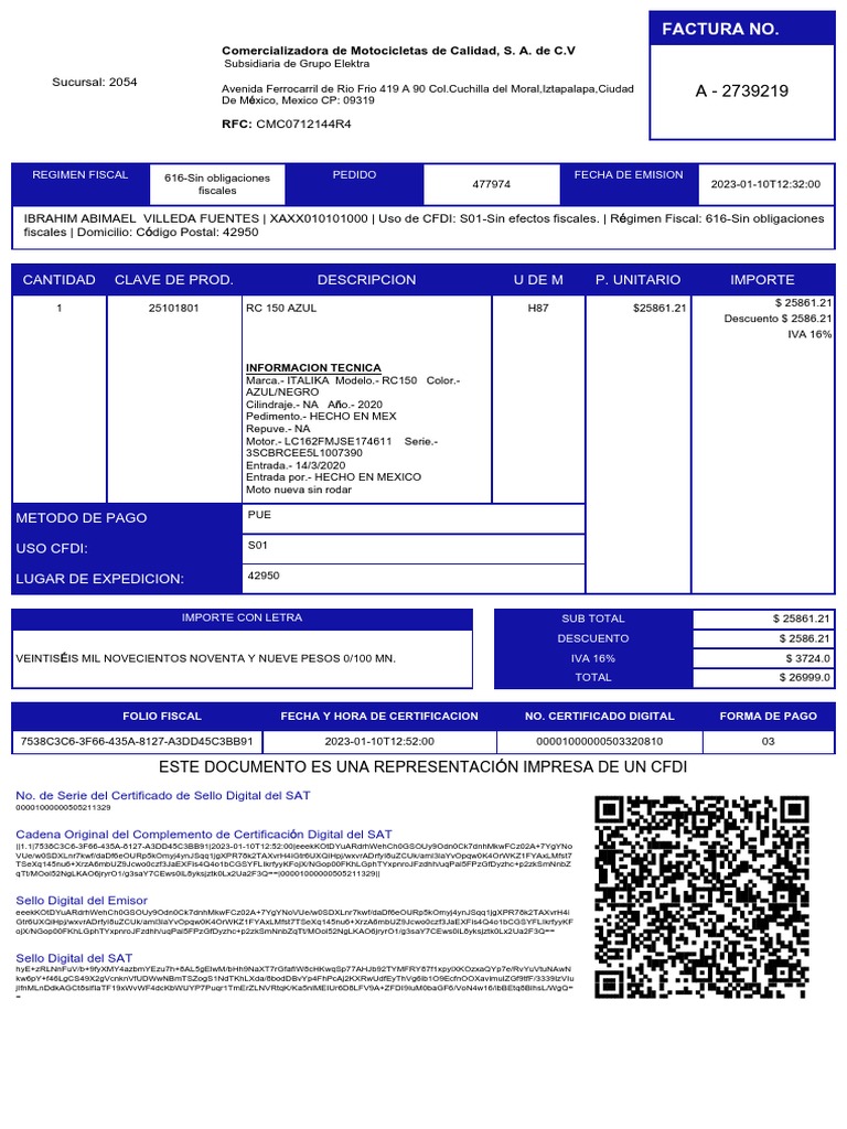 IBRAHIM ABIMAEL VILLEDA FUENTES | XAXX010101000 | Uso de CFDI: S01-Sin efectos fiscales. | Régimen Fiscal: 616-Sin obligaciones