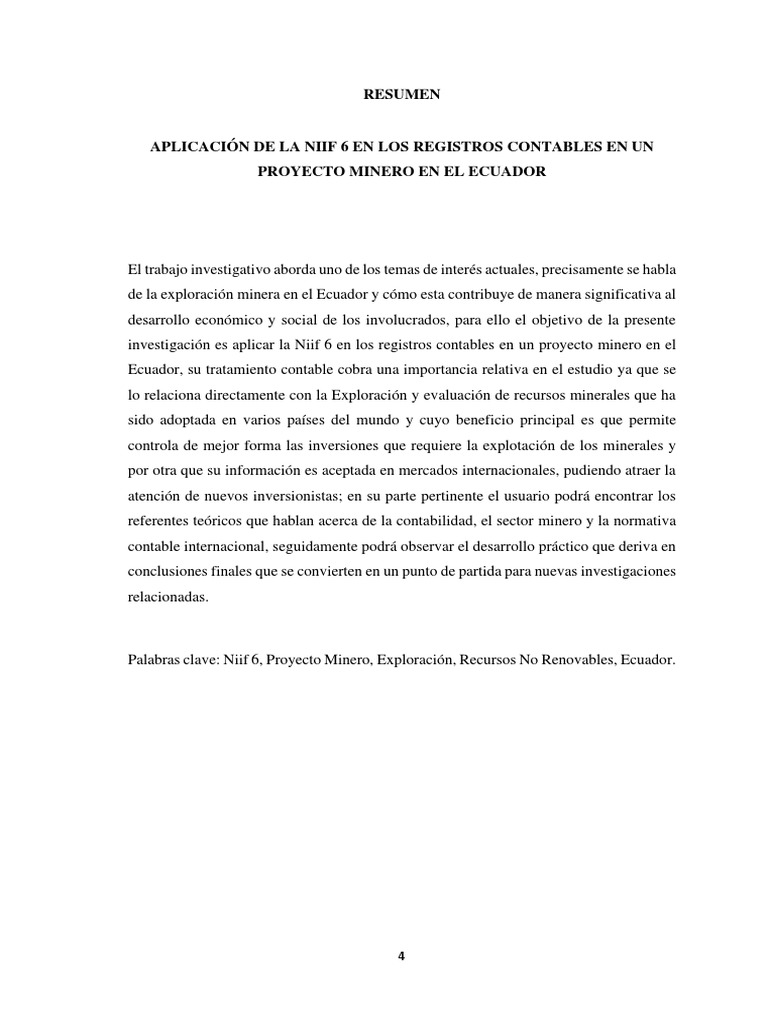 Palabras clave: Niif 6, Proyecto Minero, Exploración, Recursos No Renovables, Ecuador.