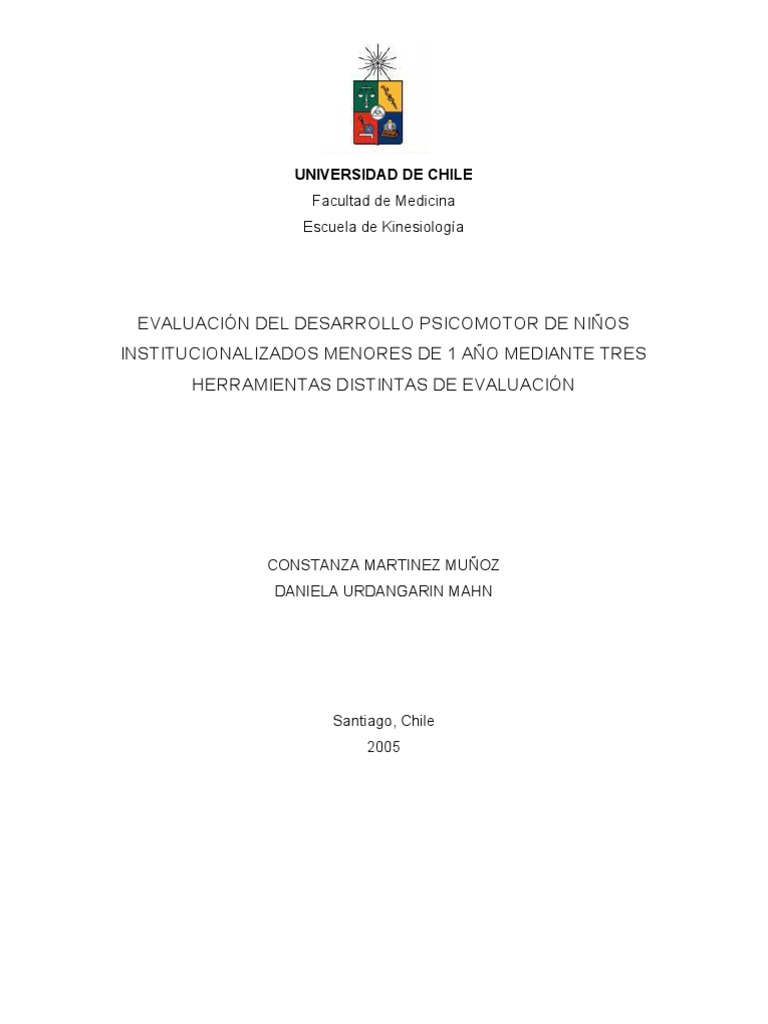 RESUMEN La evaluacin del desarrollo psicomotor de nios institucionalizados menores de un ao mediante tres herramientas distintas de evaluacin. Un estudio no experimental, descriptivo y transeccional. Para que el desarrollo progrese de una forma normal, el nio debe estar estimulado correctamente y rodeado de un ambiente adecuado (Purves 2004). En diversos estudios se ha demostrado que los nios institucionalizados carecen de estos estmulos, lo cual repercute en su desarrollo producindose muchas veces un retraso psicomotor. Es muy importante detectar a tiempo este retraso para poder intervenir y prevenir futuras consecuencias. Para esto se han diseado diversas herramientas de evaluacin. En este estudio se aplicaron la Escala de Evaluacin del Desarrollo Psicomotor de 0 a 24 meses de Soledad Rodrguez (EEDP), la Escala de Desarrollo Psicomotor de la Primera Infancia (EDPPI) y el Diagnstico Funcional del desarrollo segn el mtodo de Munich (DFDM) a 55 nios institucionalizados menores de un ao, con el fin de responder si los resultados arrojados presentaban diferencian significativas. El estudio cont con tres evaluadores distintos. Cada uno de los cuales aplic exploratorias necesarias. Los resultados mostraron diferencias en el nmero de nios con retraso que arrojaba cada herramienta, 96% de retraso segn el DFDM, 22% segn EDPPI, mientras que el EEDP arroja slo un 5% de retrasos. Esto analizado estadsticamente arroja diferencias significativas entre el EEDP y el DFDM, y entre el DFDM y EDPPI. Adems se revelaron importantes carencias presentadas por el EEDP, la herramienta ms difundida a nivel nacional. slo una de las herramientas a la totalidad de los nios en salas habilitadas en las instituciones con las condiciones