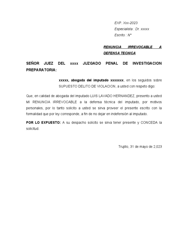 MI RENUNCIA IRREVOCABLE a la defensa técnica del imputado, por motivos