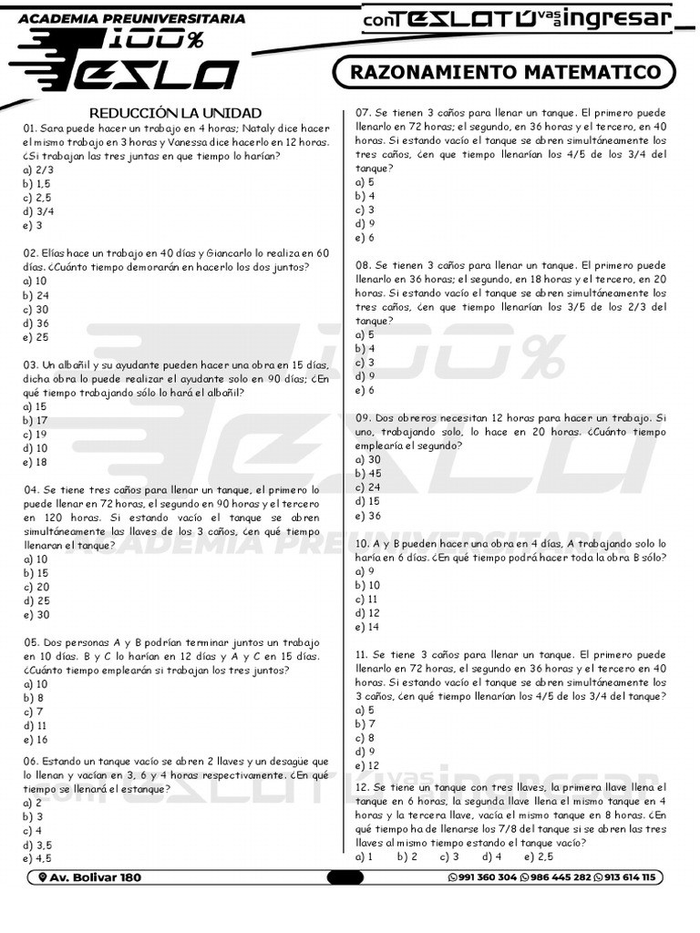 01. Sara puede hacer un trabajo en 4 horas; Nataly dice hacer llenarlo en 72 horas; el segundo, en 36 horas y el tercero, en 40