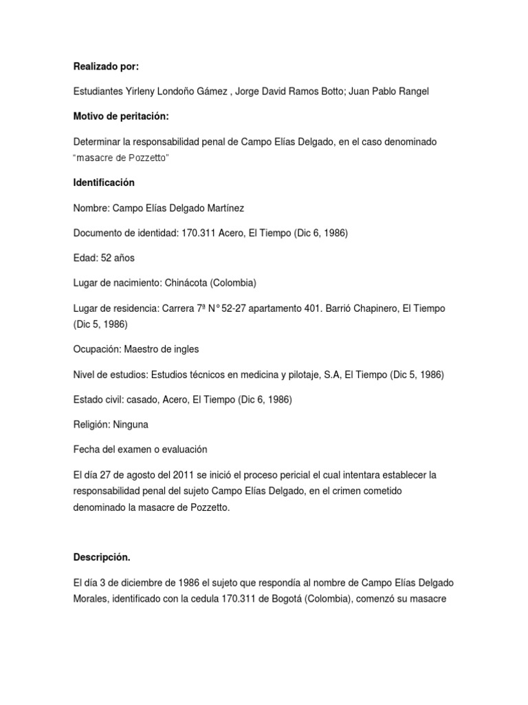 Determinar la responsabilidad penal de Campo Elas Delgado, en el caso denominado masacre de Pozzetto Identificacin Nombre: Campo Elas Delgado Martnez Documento de identidad: 170.311 Acero, El Tiempo (Dic 6, 1986) Edad: 52 aos Lugar de nacimiento: Chincota (Colombia) Lugar de residencia: Carrera 7 N 52-27 apartamento 401. Barri Chapinero, El Tiempo (Dic 5, 1986) Ocupacin: Maestro de ingles Nivel de estudios: Estudios tcnicos en medicina y pilotaje, S.A, El Tiempo (Dic 5, 1986) Estado civil: casado, Acero, El Tiempo (Dic 6, 1986) Religin: Ninguna Fecha del examen o evaluacin El da 27 de agosto del 2011 se inici el proceso pericial el cual intentara establecer la responsabilidad penal del sujeto Campo Elas Delgado, en el crimen cometido denominado la masacre de Pozzetto.