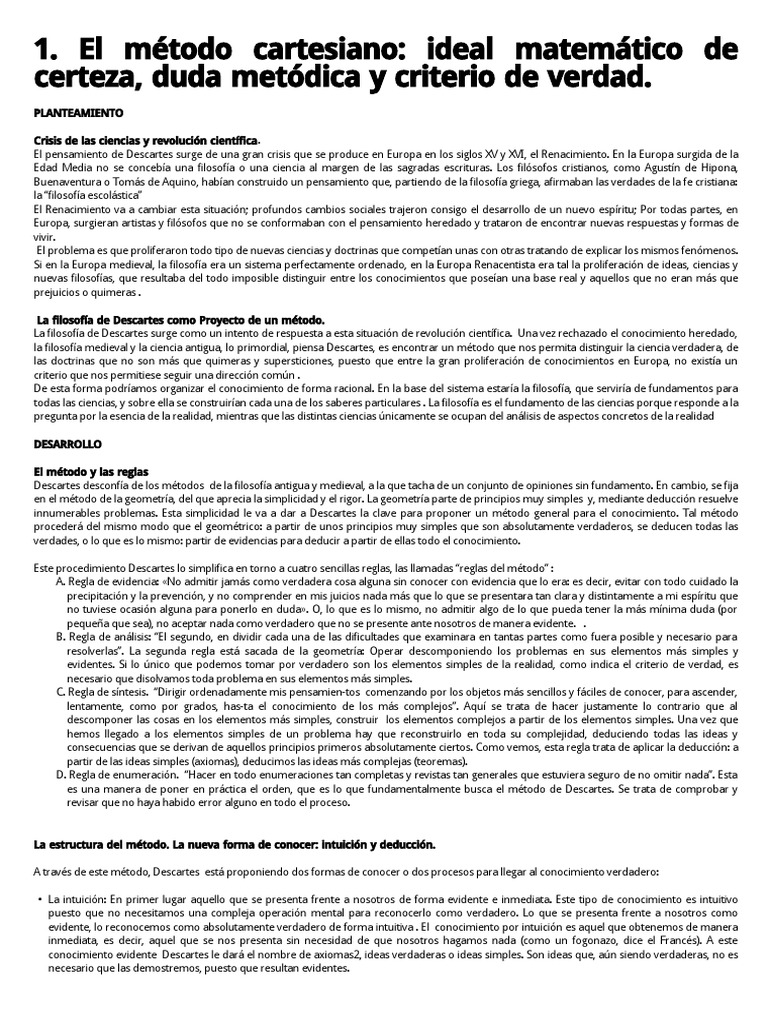 Pues, como vemos, el método propuesto por Descartes es un método de conocimiento que procede mediante estos dos procesos intelectuales, la