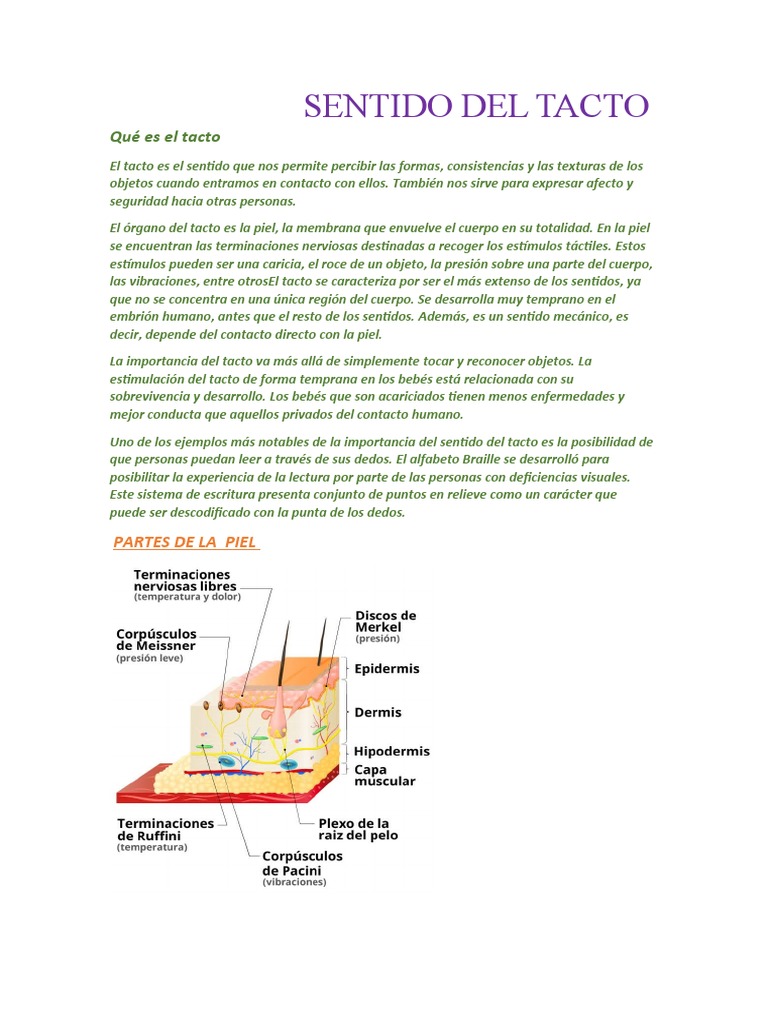 El órgano del tacto es la piel, la membrana que envuelve el cuerpo en su totalidad. En la piel
