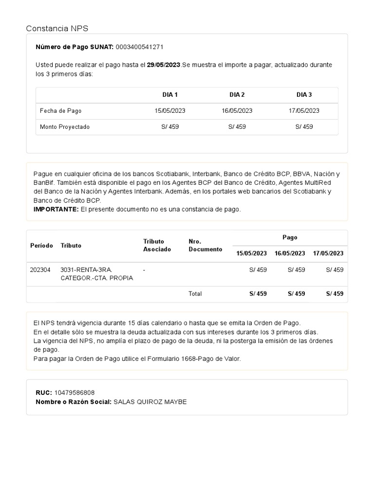 El NPS tendrá vigencia durante 15 días calendario o hasta que se emita la Orden de Pago.