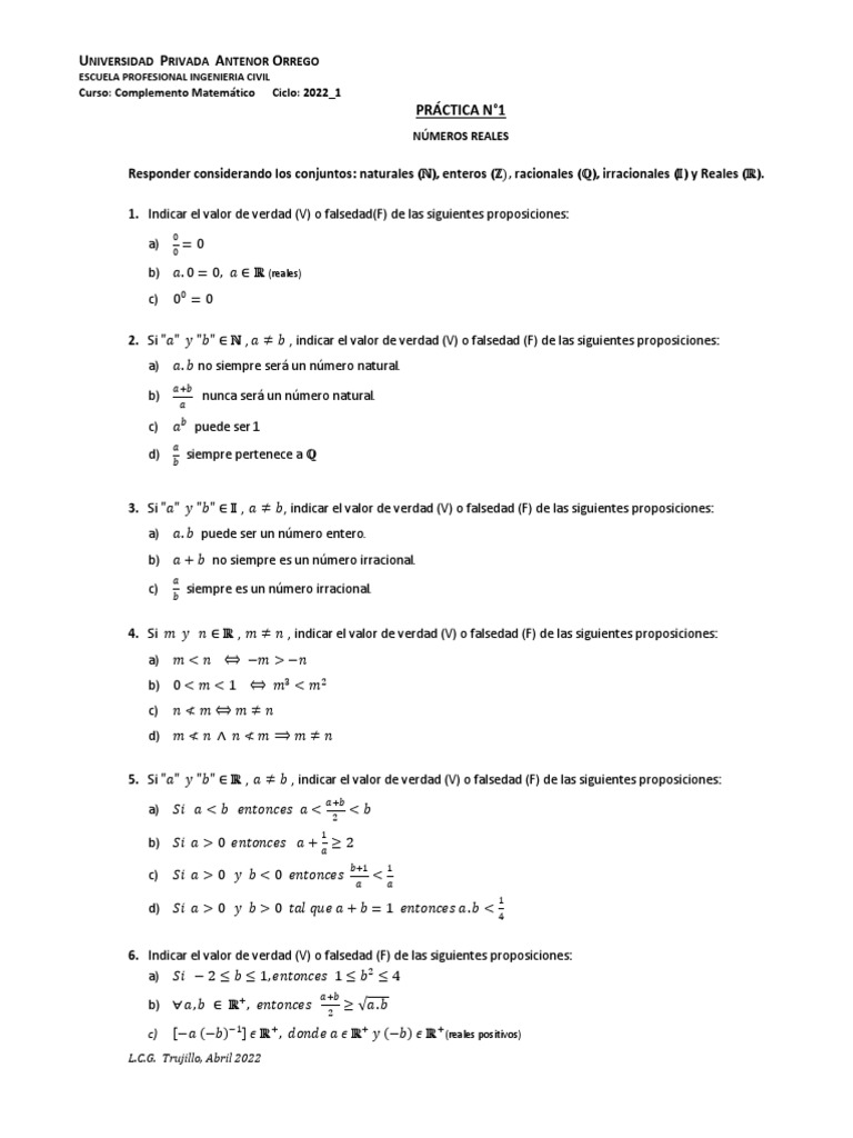 1. Indicar el valor de verdad (V) o falsedad(F) de las siguientes proposiciones: