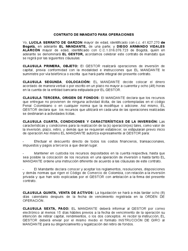 Bogotá, en adelante EL MANDANTE, de una parte; y DIEGO ARMANDO VIDALES