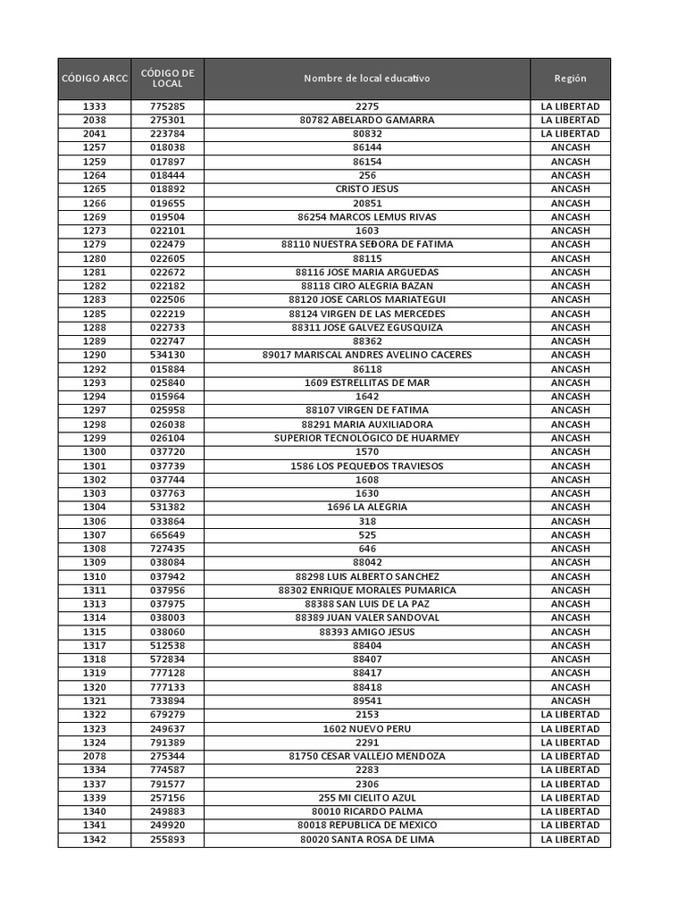 CÓDIGO ARCC CÓDIGO DE Nombre de local educativo Región