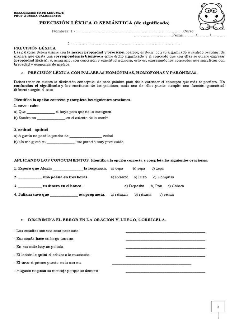 o PRECISIÓN LÉXICA: Identifica, a opción adecuada en cada caso y ESCRÍBRLA en el espacio determinado