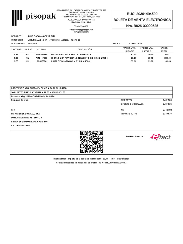 Representación impresa de la boleta de venta electrónica, consulte en www.efact.pe