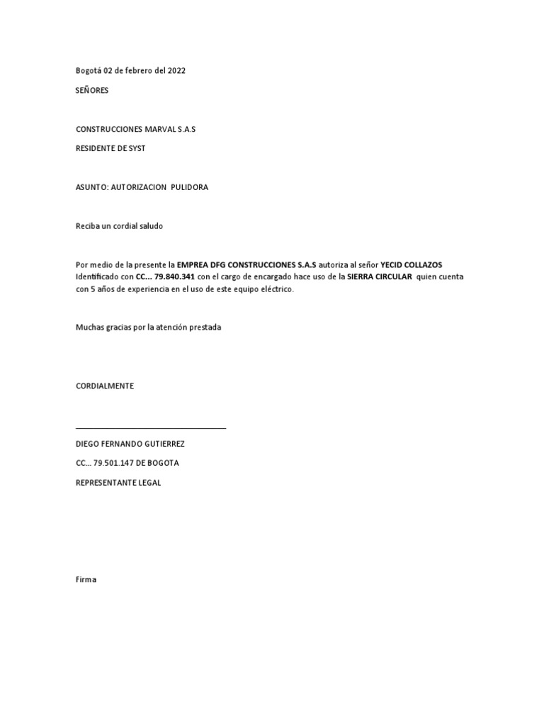 Por medio de la presente la EMPREA DFG CONSTRUCCIONES S.A.S autoriza al señor YECID COLLAZOS