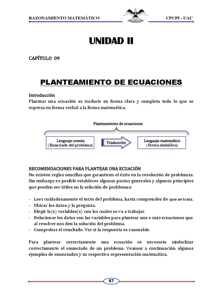 Plantear una ecuación es traducir en forma clara y completa todo lo que se