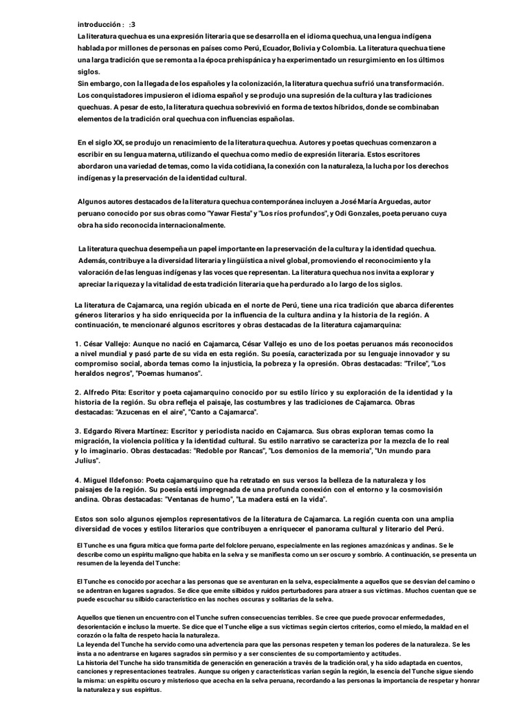 Estos son solo algunos ejemplos representativos de la literatura de Cajamarca. La región cuenta con una amplia
