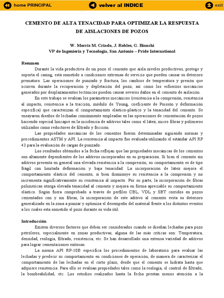 y óptima adherencia en el caso del cemento previo al cañoneo. Luego del punzamiento los mismos