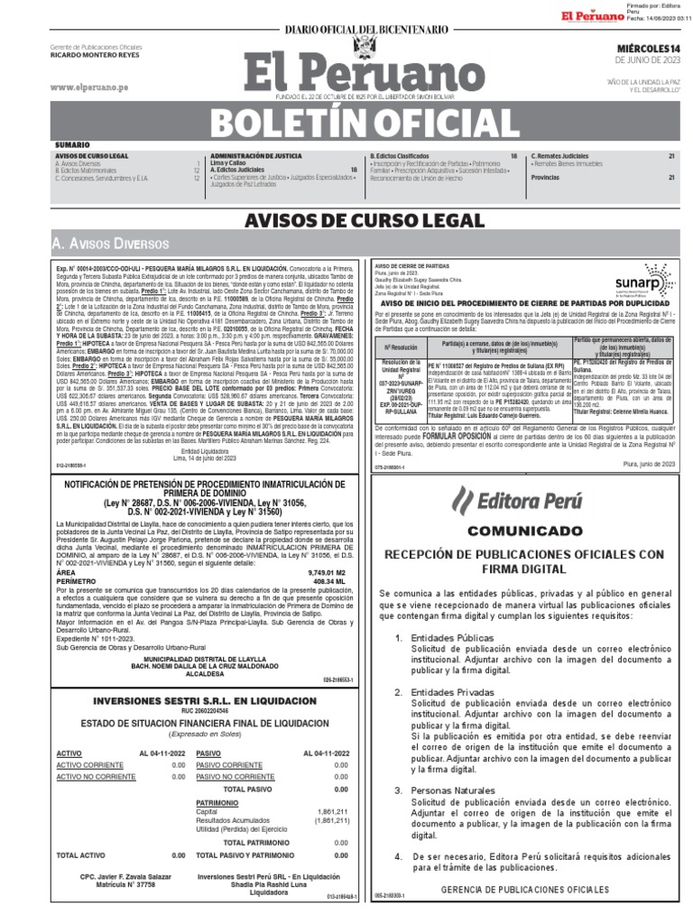 A. Avisos Diversos 1 Lima y Callao • Inscripción y Rectificación de Partidas • Patrimonio • Remates Bienes Inmuebles