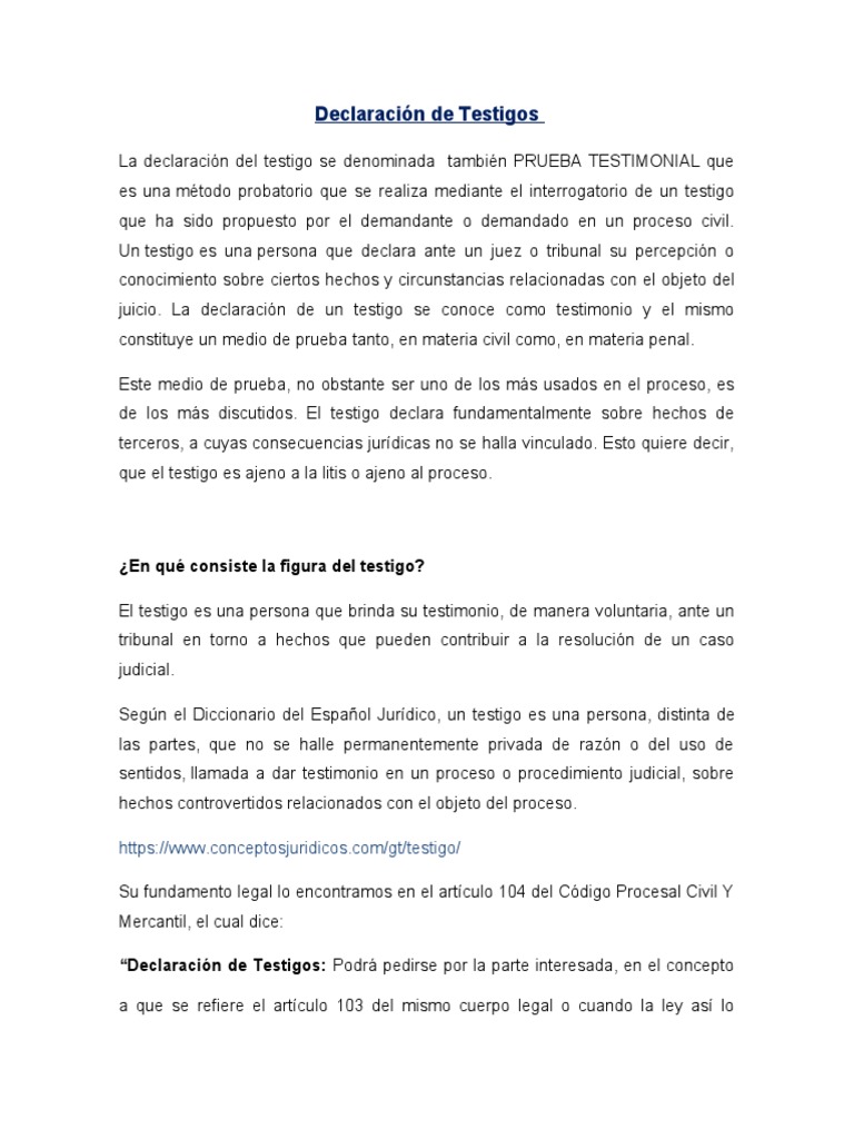 juicio. La declaración de un testigo se conoce como testimonio y el mismo